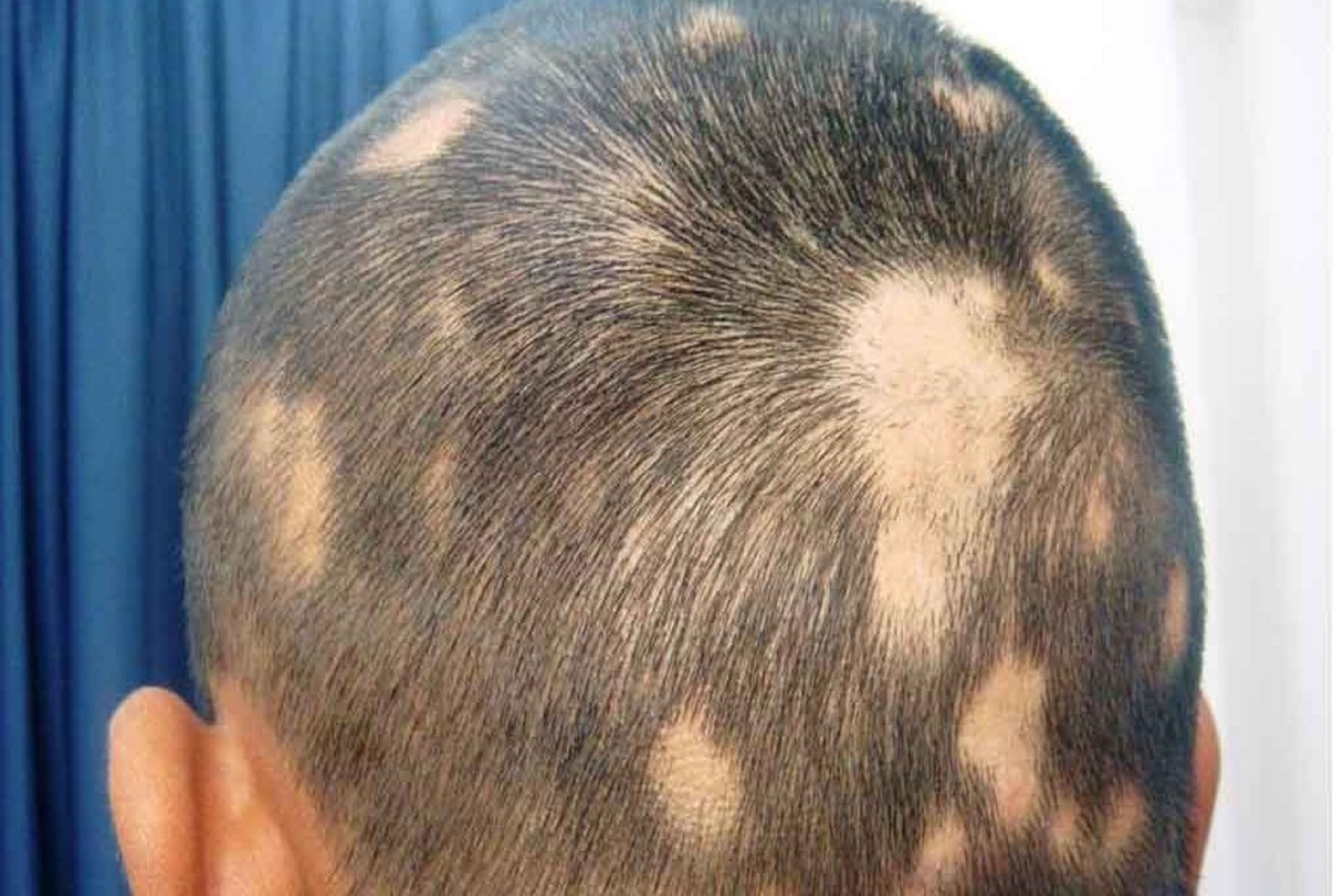 Alopecia is called hair loss and areata means patchy. This patchy baldness can develop anywhere on the body, including scalp, eyebrows, ears and beard area.